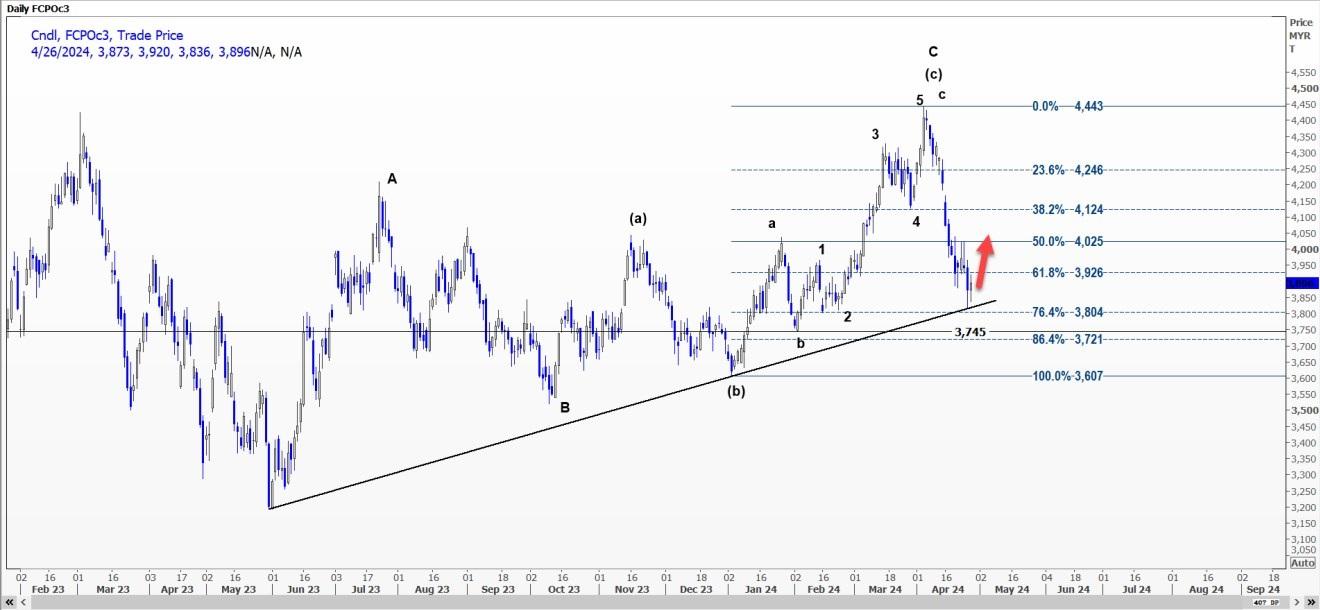 棕榈油FCPOc3价格可能升至每公吨3942-3969林吉特的区间,因为4月3日4443林吉特的高点以来的下跌趋势可能已经逆转。
