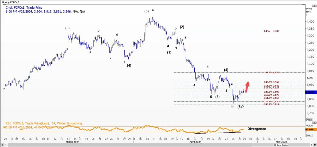 趋势的五波结构和从4月25日3817林吉特的低点强劲反弹预示着反转。当天形成的小幅共同缺口可能会被填补。