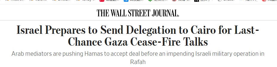 美国《华尔街日报》当地时间周二报道称,以色列和埃及官员周二说,以色列准备在未来几天派遣一个代表团前往开罗,讨论在加沙地带停止战斗的问题。与此同时,阿拉伯的调解人向哈马斯施压,要求其在以色列即将对加沙南部城市拉法采取军事行动之前接受停火条款。