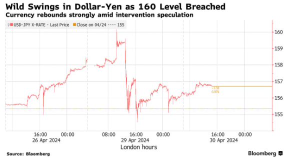 周一,日元/美元汇率自1990年以来首次触及160后,疑似干预行动就发生了。当天晚些时候,日元大幅反弹,该货币上涨超过2%。引发了日本自2022年以来,首次重返市场以支撑日元汇率的猜测。