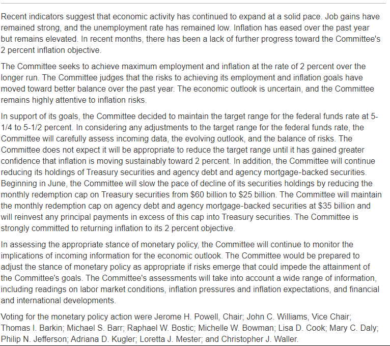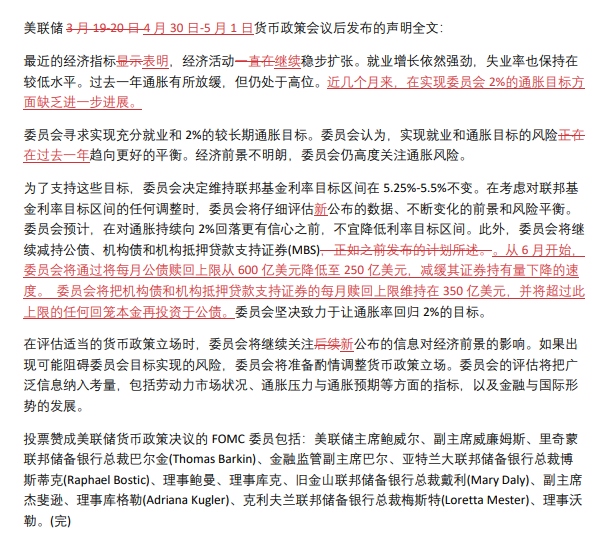 为了支持这些目标,委员会决定维持联邦基金利率目标区间在5.25%-5.5%不变。在考虑对联邦基金利率目标区间的任何调整时,委员会将仔细评估新公布的数据、不断变化的前景和风险平衡。委员会预计,在对通胀持续向2%回落更有信心之前,不宜降低利率目标区间。此外,委员会将继续减持公债、机构债和机构抵押贷款支持证券(MBS)。从6月开始,委员会将通过将每月公债赎回上限从600亿美元降低至250亿美元,减缓其证券持有量下降的速度。 委员会将把机构债和机构抵押贷款支持证券的每月赎回上限维持在350亿美元,并将超过此上限的任何回笼本金再投资于公债。委员会坚决致力于让通胀率回归2%的目标。