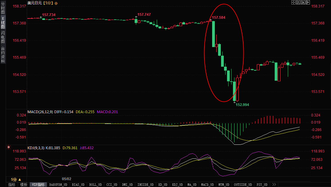 周三(5月1日)美市收盘后,美元/日元快速下跌近460点,连破157、156、155、154、153五大关口,刷新逾两周低点至152.993。