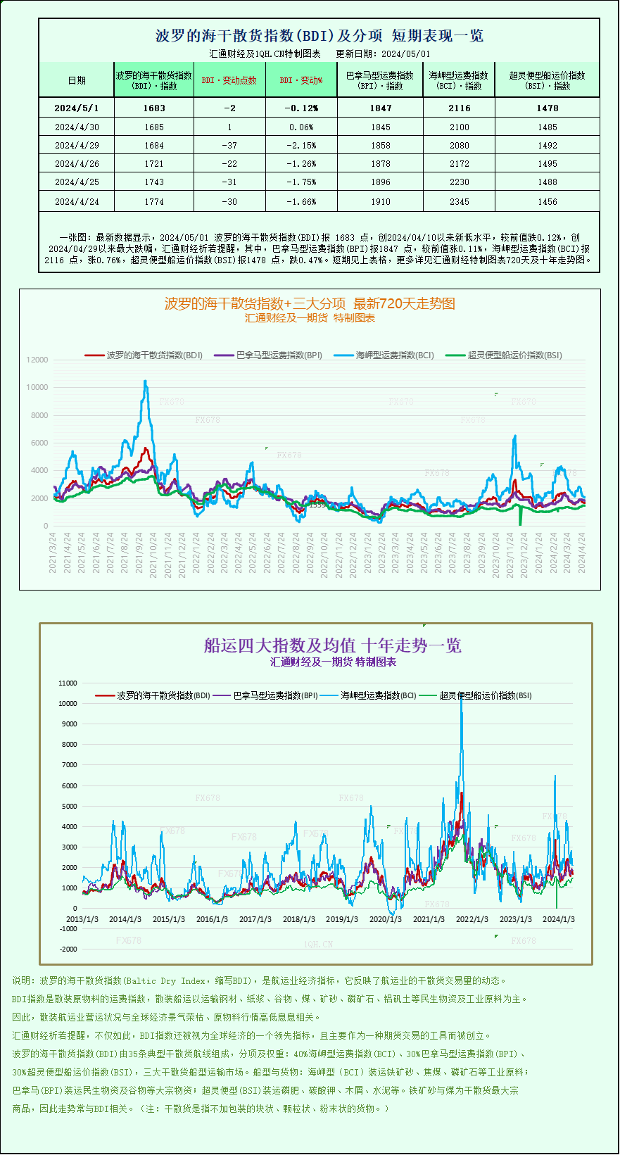 汇通财经APP讯——最新数据显示,2024/05/01 波罗的海干散货指数(BDI)报 1683 点,创2024/04/10以来新低水平,较前值跌0.12%,创2024/04/29以来最大跌幅,其中,巴拿马型运费指数(BPI)报1847 点,较前值涨0.11%,海岬型运费指数(BCI)报2116 点,涨0.76%,超灵便型船运价指数(BSI)报1478 点,跌0.47%。波罗的海干散货指数+三大分项的最新720天走势图、十年走势图等详见汇通财经特制图表。