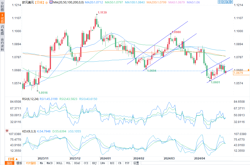 欧元/美元仍处于较长期的下行趋势中,日线图显示了一个新的、负面的K线形态。第二个看跌旗形正在形成,趋势支撑位现已突破,而上破20日简单移动均线的尝试失败。这使得欧元/美元可能会跌破4月16日的低点1.0601,下一个重要的支撑水平是1.0512。跌破1.0601的低点也将继续跌至从去年年底开始的一系列更低的高点和更低的低点。