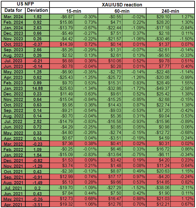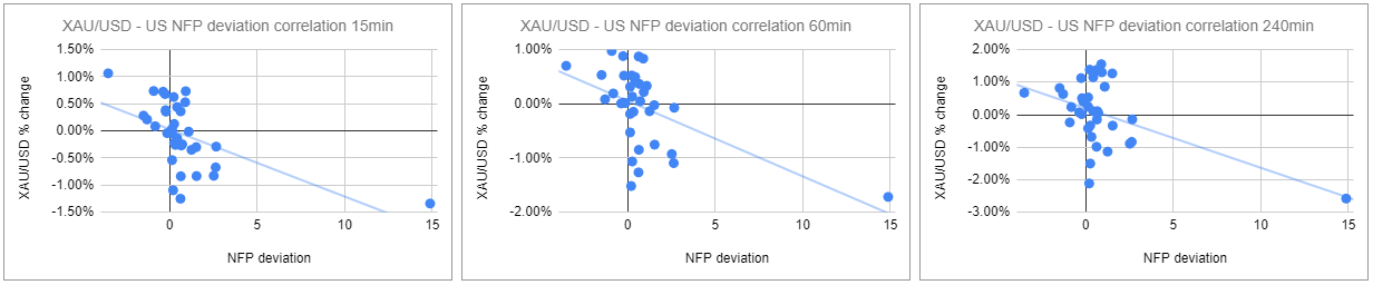 我们绘制了非农数据发布后的15分钟、1小时和4小时内的黄金价格反应。然后,我们将黄金价格的反应与实际非农结果与预期结果之间的偏差进行比较。