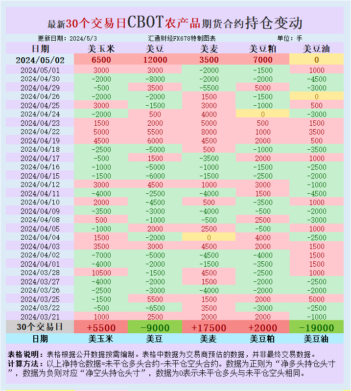 本周四(5月2日),大宗商品基金增加CBOT美豆、美玉米、美麦、美豆粕机性净多头头寸。最新30个交易日,大宗商品基金增加美豆、美豆粕、美麦投机性净多头头寸,增加美豆、美豆油投机性净空头头寸。