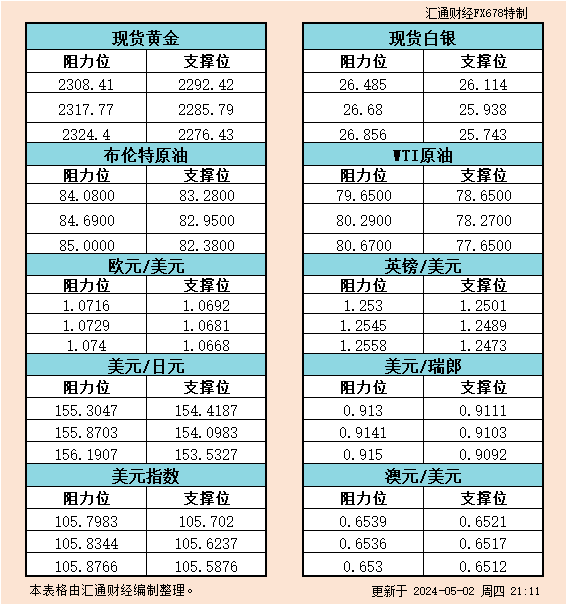 标题:5月2日美市支撑阻力:金银原油+美元指数等六大货币对