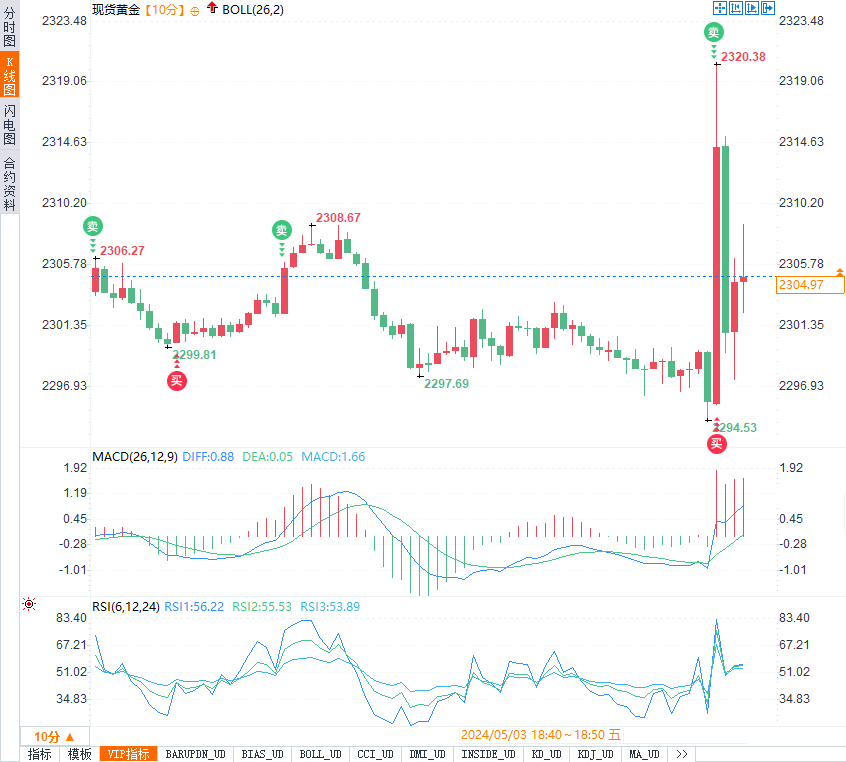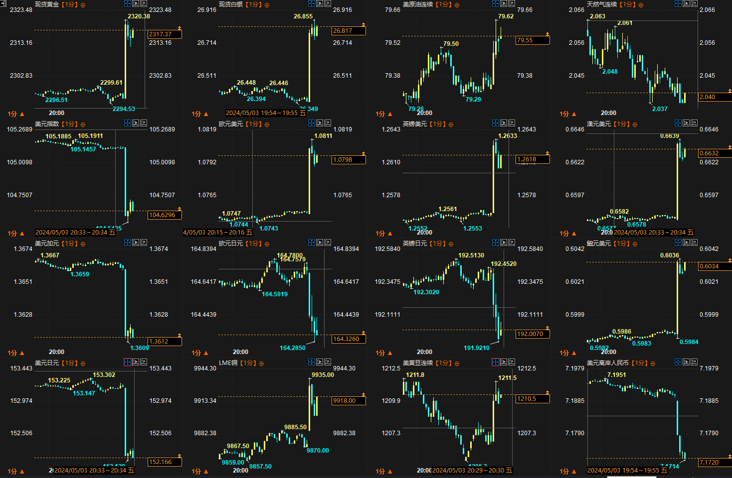 由于本次非农出乎市场预料,数据公布后市场反应非常激烈,以下是数据公布后1分钟内的市场反应。其中,黄金一分钟跳涨15美元至2320美元/盎司,白银一分钟跳涨0.5美元至26.855,