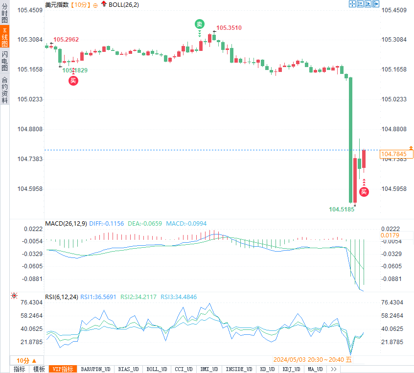 美元指数暴跌约65点,后收复部分跌幅,截至发稿报104.7719,日内下跌0.6%。