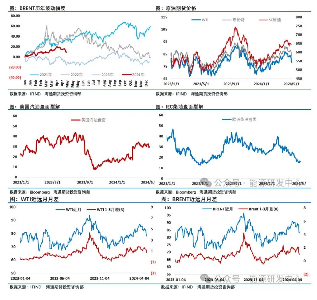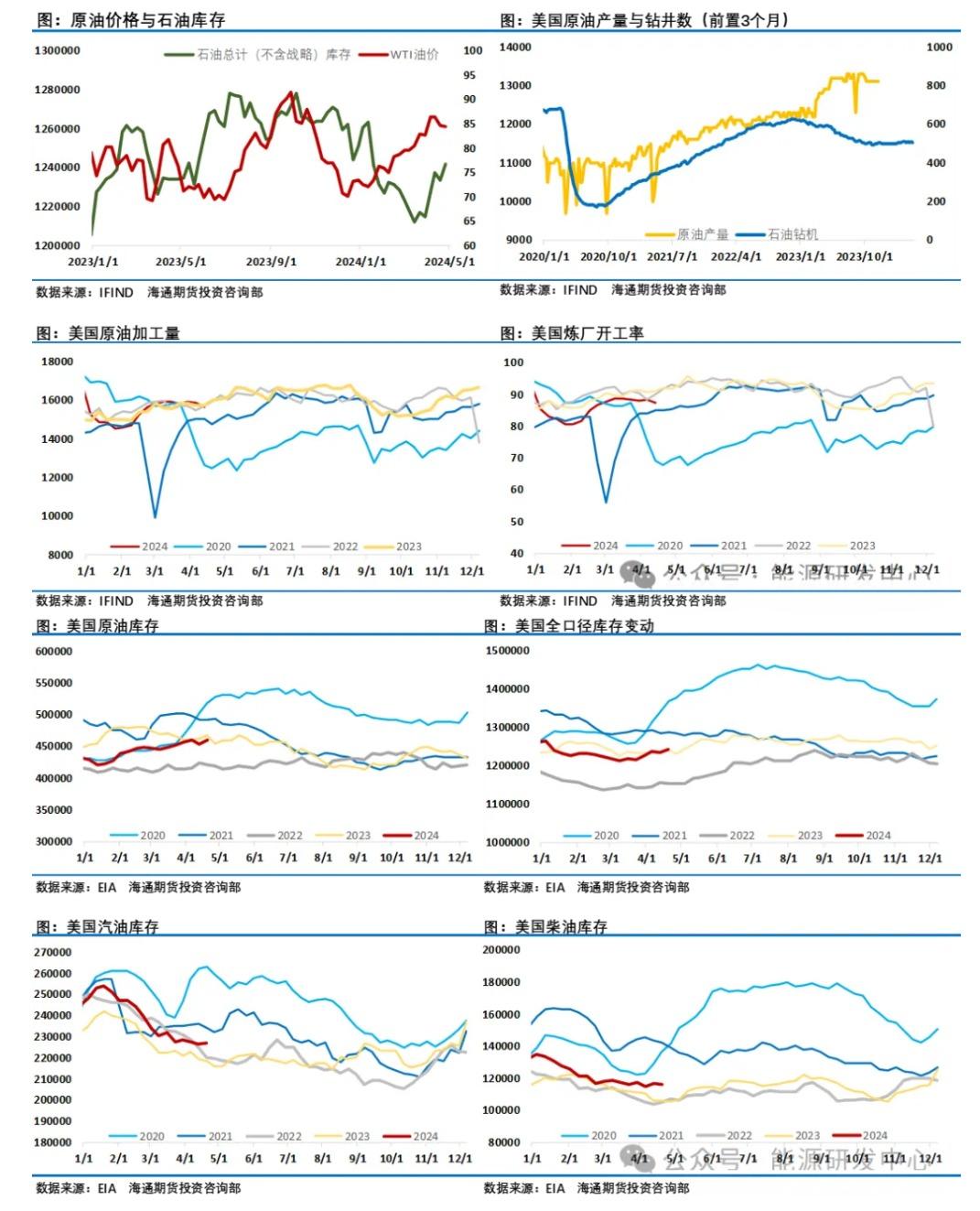 油价大幅下跌之际,投资者自然将目光再次转移到了欧佩克+身上,在一季度随着乌克兰无人机袭击俄罗斯炼厂以及围绕哈以冲突的中东地缘事件增加了市场对原油供应稳定性的担忧,但随着时间推移,尤其是4月之后供应中断风险并没有出现,而需求端缺失亮点让投资者又开始担心原油市场供需平衡的后续发展,据媒体调查的87%的交易员和分析师预测,欧佩克+将延长减产措施至今年年底。另根据一项调查,欧佩克上月原油产量保持稳定,表明该组织最新的减产行动尚未完成。欧佩克4月原油产量为2681万桶/日,较前一个月减少约5万桶/日。利比亚和伊拉克的小幅增产被伊朗和尼日利亚的减产所抵消。伊拉克和阿联酋的产量仍比商定限额高数十万桶/日。上个月变化最大的是利比亚,将产量提高了6万桶/日,至119万桶/日。伊拉克产量温和上升至422万桶/日,比其目标水平高出约22万桶/日。伊朗和尼日利亚的供应量分别减少5万桶/日,至313万桶/日和142万桶/日。沙特的产量则保持稳定,在每天约900万桶。欧佩克+定于6月1日举行会议,决定是否将当前的产量限制延长到今年下半年。5月3日消息显示欧佩克称伊拉克今年将补偿性减产60.2万桶/日,哈萨克斯坦将补偿性减产38.9万桶/日,看起来这似乎是个很难实现的减产数字。EIA数据显示美国国内原油产量已经连续8周维持在1310.0万桶/日不变,贝克休斯数据截至5月3日当周,美国钻井公司在一周内削减的石油和天然气钻井设备幅度为2023年9月以来以来最大。而对于需求层面摩根大通的一份报告称高频需求指标显示,4月全球石油需求增长190万桶/天,比其预测的低20万桶/天。前四个月全球石油使用量同比增长140万桶/天,而11月份的预测为增长200万桶/天。第一季度表现不佳几乎完全是由于冬季气候变暖以及由此导致的取暖燃料需求减弱。4月美国汽油需求可能平均为850万桶/天,比早先的预测低40万桶/天,原因可能是美国汽油零售价格从1月低点上涨了20%。欧洲4月石油需求继续在-10万桶/天到+10万桶/天的范围内波动,与1400万桶/天的预测值相近。