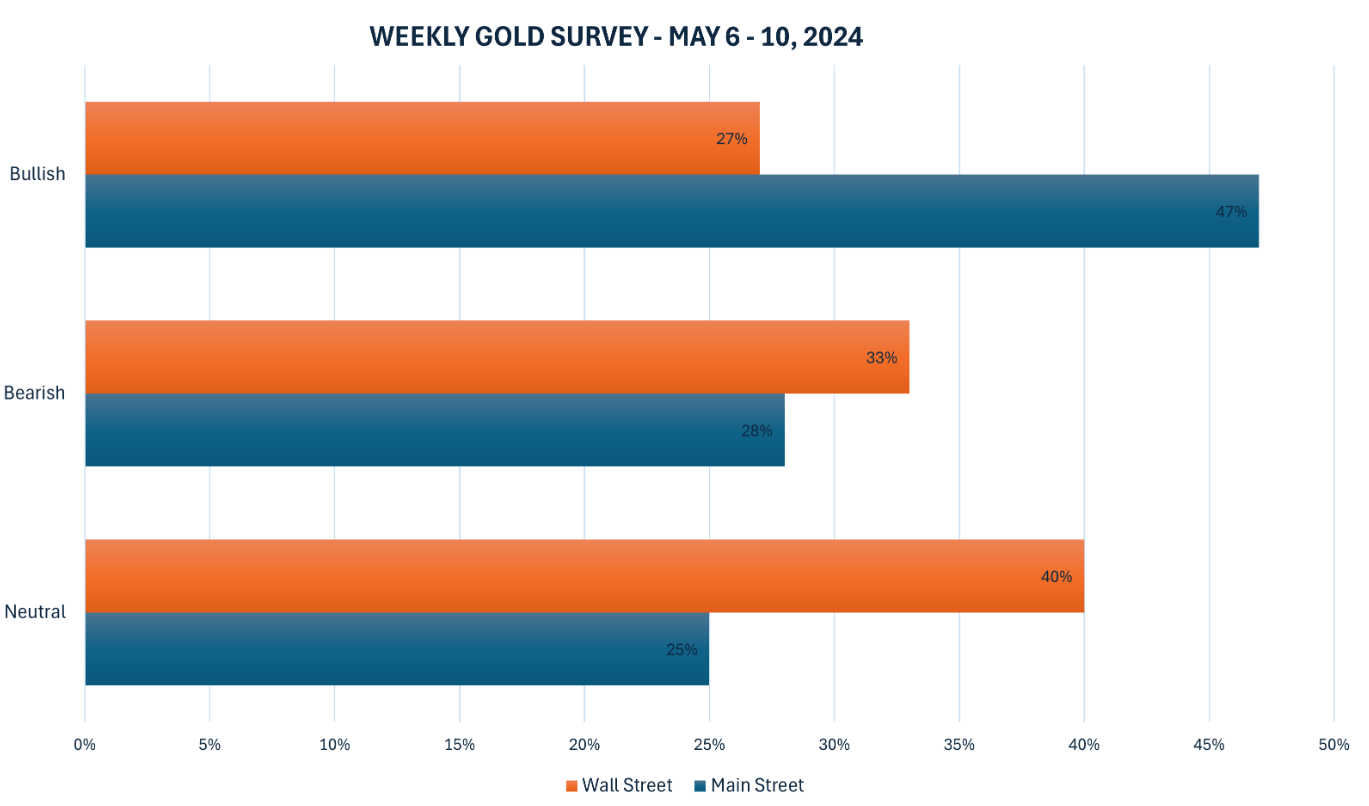 上周,15位华尔街分析师参与了Kitco News黄金调查,经过两周的下行盘整,大多数人认为金价近期将进一步下滑。只有四位专家(即 27%)预计金价未来一周将上涨,而五位分析师(即 33%)预测金价将下跌。六位专家(即 40% 的受访者)认为黄金将横盘整理。