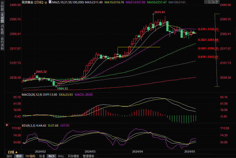 现货黄金窄幅震荡,目前交投于2315.49美元/盎司附近。金价周二继前一交易日上涨后出现下跌,以军夺取拉法口岸阻断援助路线,美国仍相信能打破停火僵局,打压黄金的避险需求,但金价跌幅不大,因为交易商仍在关注美联储的降息前景。