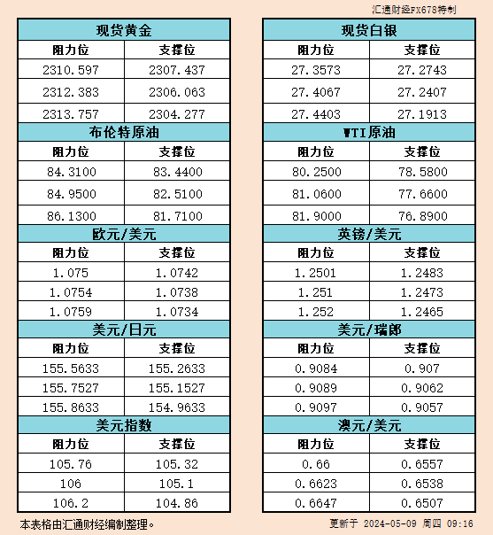 5月9日亚市支撑阻力:金银原油+美元指数等六大货币对