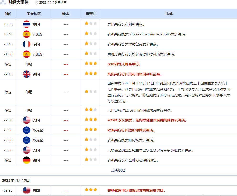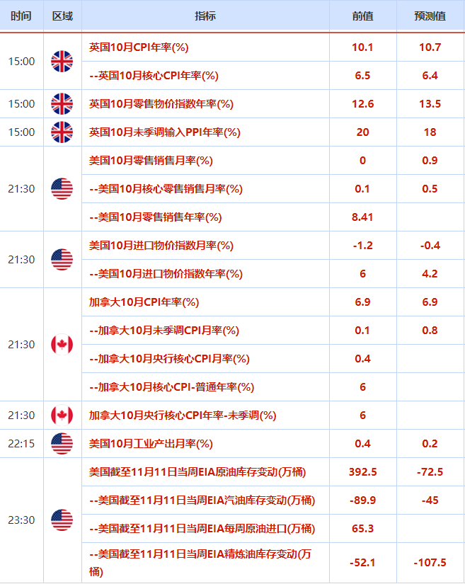 本交易日将出炉英国10月CPI数据、美国10月零售销售数据和工业产出月率、加拿大10月CPI数据,投资者需要予以关注。另外,需要关注美联储官员、英国央行官员和欧洲央行官员的讲话。