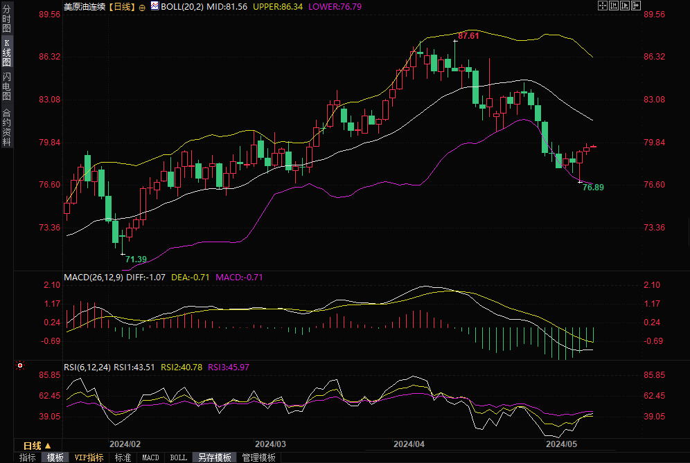 美原油窄幅震荡,目前交投于79.63美元/盎司附近。油价周四升至一周最高,此前中国和美国的数据显示世界最大两个原油消费国的需求可能攀升,另外,以色列打击拉法东部,停火谈判无果而终,也给油价提供支撑。