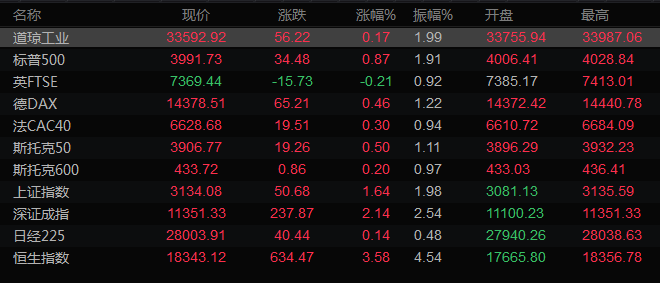 美股收盘情况:道琼斯工业指数上涨0.17%,至33592.92点;