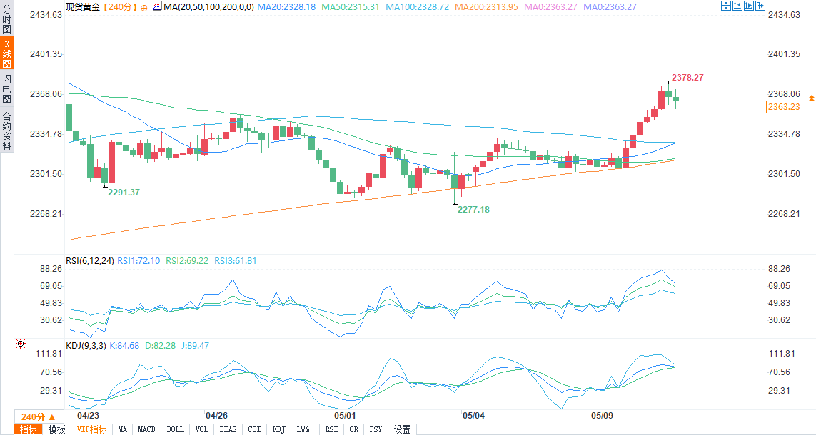 汇通财经APP讯——周五(5月10日)美市早盘,随着加沙地缘政治紧张局势的加剧巩固了贵金属的避险吸引力,以及近期数据引发对美国劳动力市场的担忧,引发了对美联储可能比此前预期更早降息的猜测,黄金价格上涨,盘中一度逼近2380。