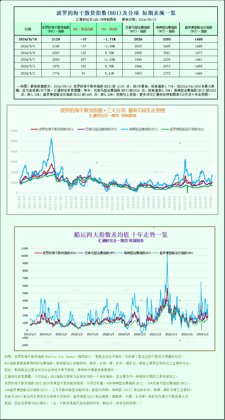 汇通财经APP讯——最新数据显示,2024/05/10 波罗的海干散货指数(BDI)报 2129 点,创3天最低,较前值跌1.71%,创2024/04/29以来最大跌幅,且为连续第2天下跌。其中,巴拿马型运费指数(BPI)报2026 点,较前值涨0.30%,海岬型运费指数(BCI)报3292 点,跌3.32%,超灵便型船运价指数(BSI)报1485 点,跌0.20%。波罗的海干散货指数+三大分项的最新720天走势图、十年走势图等详见汇通财经特制图表。