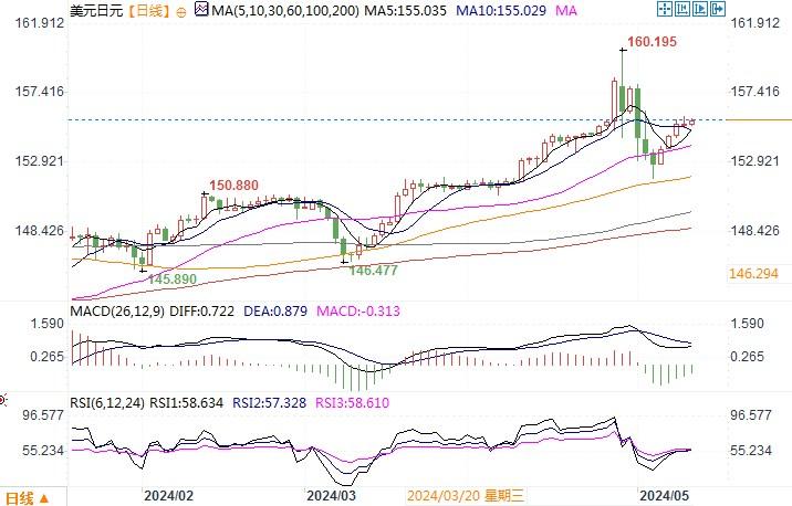 当日冲高受阻后,收盘价与前日持平报155.46。周四公布的美国上周初请失业金人数增加了2.2万人,经季节性调整后为23.1万人,为去年8月底以来的最高水平,高于路透调查中经济学家预期的21.5万人。上周的美国就业报告弱于预期,且其他数据显示,3月职位空缺降至三年来的最低水平。市场人士认为,劳动力市场疲软预示着消费者将开始放缓支出,进而帮助通胀降温。如果我们看到下周美国消费者/生产者物价指数以及零售销售数据涨幅进一步放缓,那么可能会打击主导市场已久的美国例外论交易,进而提升美联储年内降息的预期。美元的压力届时恐会顿增。而日本央行的会议记录显示,在4月政策会议上,绝大多数决策者持鹰派立场,许多人认为有必要稳步加息。日本央行总裁植田和男还表示,央行在指导货币政策时将仔细审查日元近期的跌势。植田和男的表态,也似乎暗示日本当局必要时,仍会继续使用干预手段去限制日元的贬值。技术层面上,日线级别图上,美元/日元隔夜呈现十字星,MACD、RSI等技术指标仍保持下顷之态,美元此轮回升颇有点缺乏劲道的味道。从月线级别图来观察,顶背离现象较为明显(见附图)。若本轮反弹高点低于前高,须得当心美元/日元出现筑顶渐渐回落的风险。