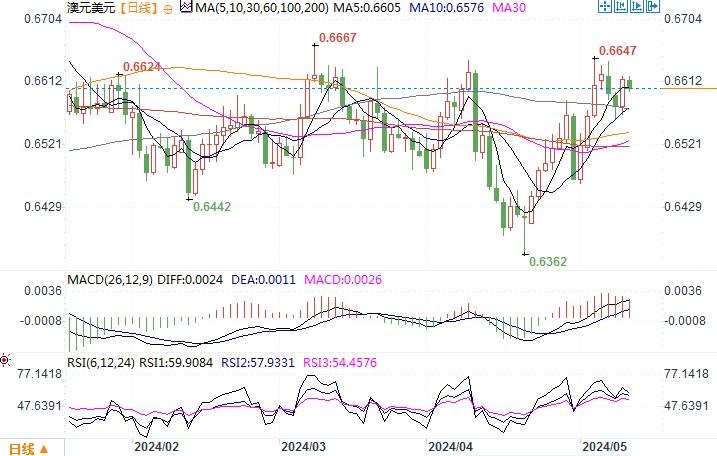 周四收盘上涨0.6%报0.6619。美国上周初请失业金人数增幅超预期,表明就业市场放缓,从而提振降息希望,美元几乎全线走软,澳元也是借机反弹回升。本周澳洲央行长期维持较高利率的立场将继续支撑澳元。此外,中国贸易数据显示4月进口增长超过预期, 其中铁矿石进口同比增长近13%,也给澳元走升援以助力。短期内,利好澳元的因素有所增多。日线图上,澳元/美元继续维持在布林带通道上轨运行,技术指标MACD信号线保持上扬,澳元向上走势开始变得积极。上方若能突破此前宽幅震荡区间上沿0.6660强阻力,澳元/美元有望向更高点回升。目前下方初步的强支撑还是落在0.6550附近。