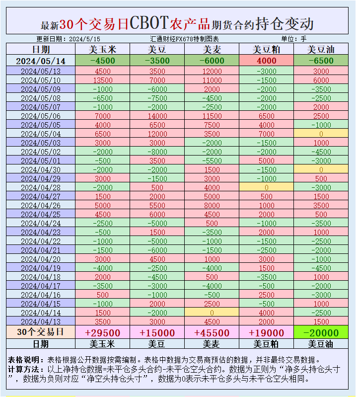 根据汇通财经观察,海外交易商估算的结果显示,本周二(5月14日),大宗商品基金增加CBOT美豆、美玉米、美豆油、美麦投机性净空头头寸,增加美豆粕投机性净多头头寸。最新30个交易日,大宗商品基金增加美豆粕、美麦、美玉米、美豆投机性净多头头寸,增加美豆油投机性净空头头寸。