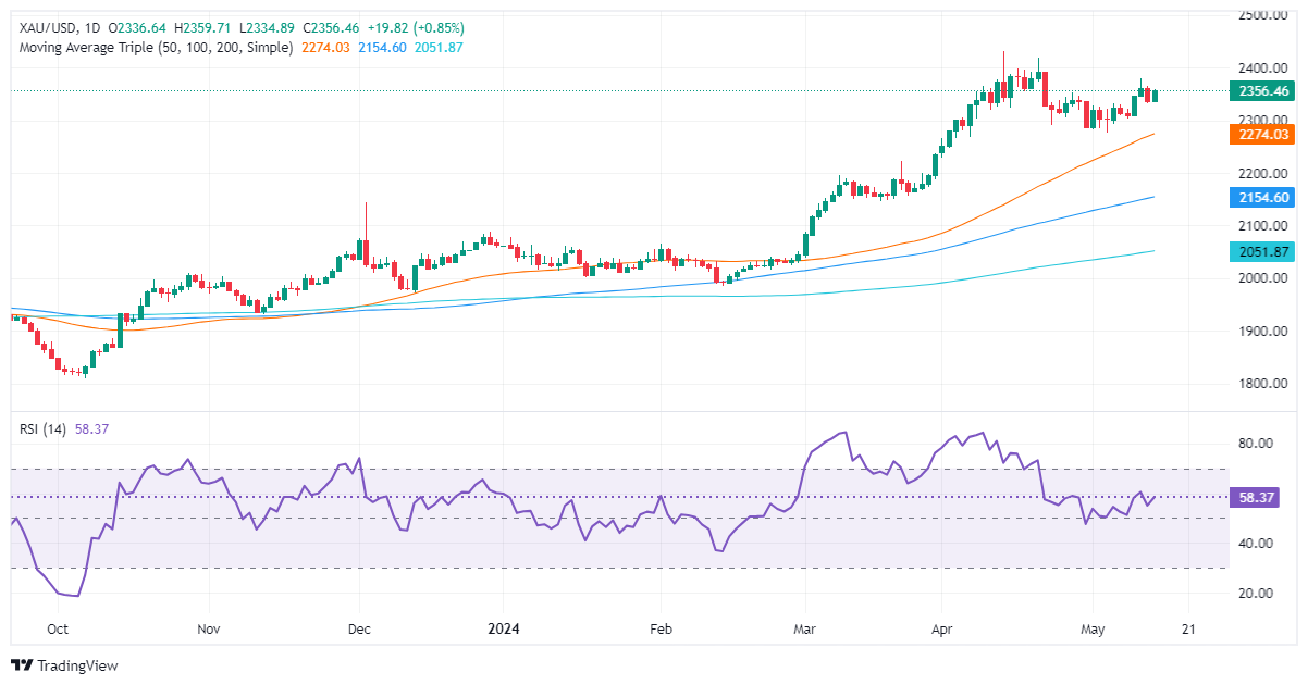 FXStreet分析师Christian Borjon Valencia指出,金价在周一录得跌势后延续上涨趋势,但仍低于5月10日创下的最新周期高点2378美元/盎司。这可能会限制金价的波动区间。根据相对强弱指数(RSI)的读数,势头有利于黄金多头。