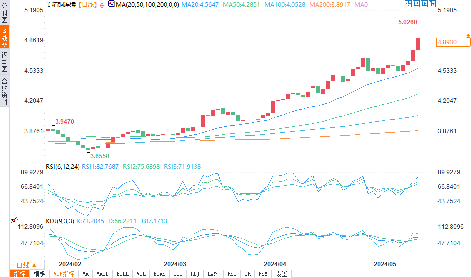 纽交所COMEX期铜今天收盘上涨1,525点,报4.9185美元。价格收于中档附近,再创合约新高。铜多头近期整体技术优势强劲。在K线图上,价格处于三个月的上升趋势中。铜多头的下一个上行目标是推动并收于技术阻力位5.15美元上方。空头的下一个下行目标是收于支撑位4.6美元以下。首个阻力位见于今天的合约高点5.026美元,然后是5.05美元。第一个支撑位见于4.8500美元,然后是4.800美分。