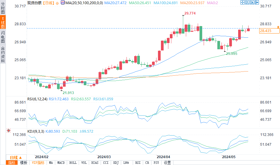 现货白银报28.424美元/盎司,涨幅0.88%。COMEX期铜报4.8860美元/磅,涨幅2.52%。