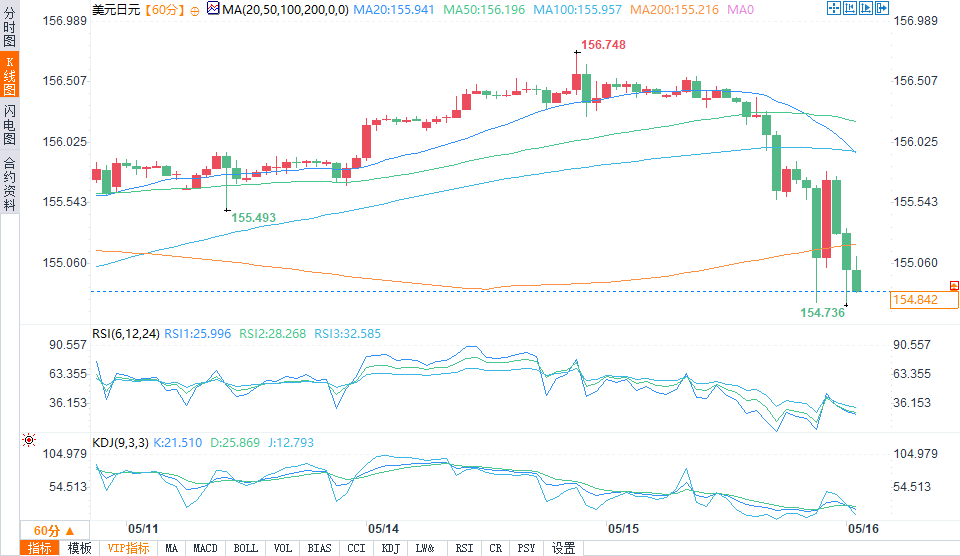 汇通财经APP讯——周三(5月15日)美市中,美元/日元汇率一度下跌1.1%,至154.736,随后收窄部分跌幅。最近几周,日元汇率大幅波动,4月底自1990年以来首次跌破160,随后在当局两轮疑似干预后大幅反弹。