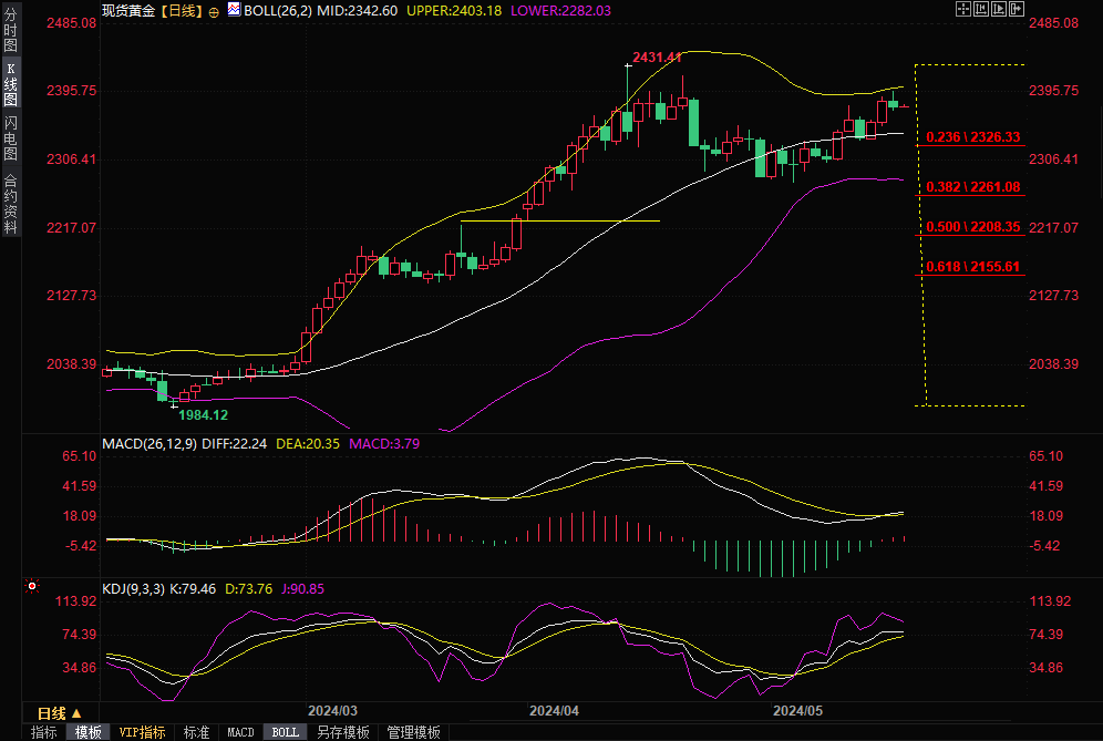 现货黄金窄幅震荡,目前交投于2379.00美元/盎司附近。金价周四收到2400关口和布林线上轨附近的双重阻力压制后走低,因美元和美债收益率反弹,但美国通胀降温的迹象巩固了美联储今年降息的希望,并使金价保持在一个月峰值附近。