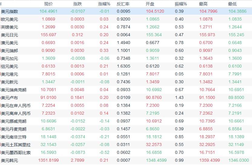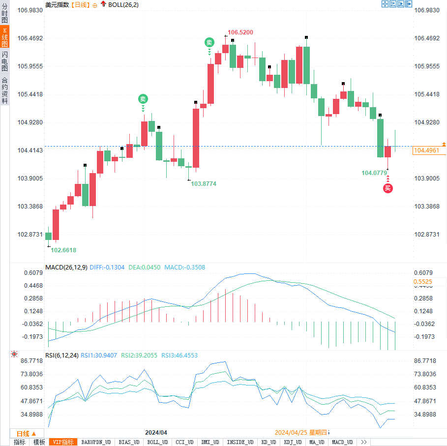 美元指数在104.49附近维持疲软,最终以一波回跌结束了本周的行情,周线下跌0.79%。尽管市场对美国经济实现软着陆抱有希望,但美联储官员的谨慎态度以及对通胀阻击战进展的担忧,限制了美元的跌幅。此外,美国10年期和2年期国债收益率的V型走势,也反映了市场对未来利率走向的不确定性。