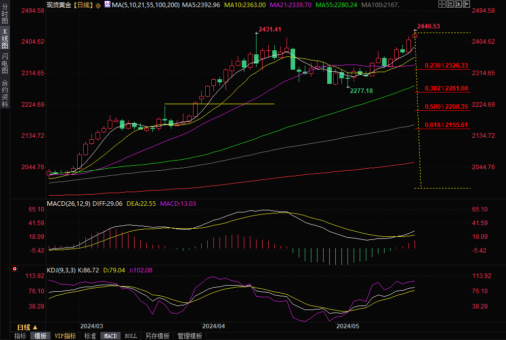 现货黄金震荡冲高,一度刷新历史高点2440.53美元/盎司,一方面是上周美国通胀数据出炉后,市场对美联储降息预期升温,持续支撑金价;另一方面,对地缘局势的担忧情绪也给不断给金价提供避险买盘支撑。