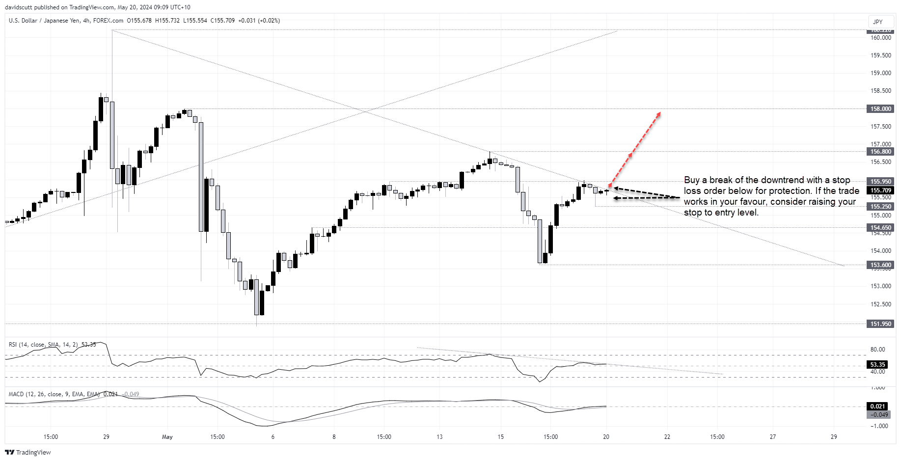 如果下跌趋势消退,交易者可以在趋势线下方设置止损单以突破买入以求保护。初步目标为水平阻力位155.95。