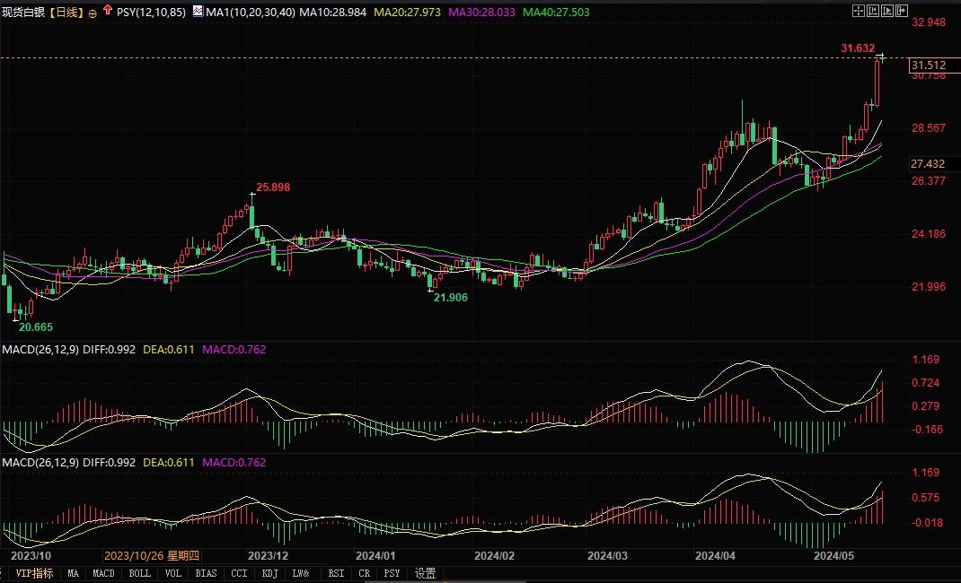现货白银已经突破了30美元的阻力,交投于31.51美元左右。