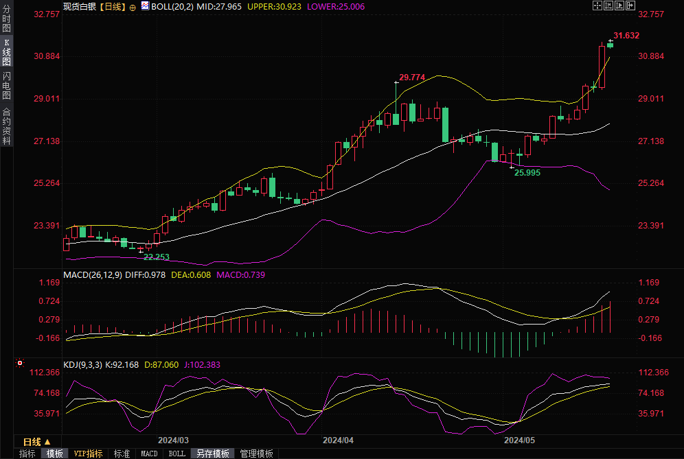 现货白银在突破30美元的主要阻力位后跳涨4.8%,至每盎司 31.6美元附近,上周五收报31.40美元/盎司。白银上一次触及30美元是在2021年初,但十多年来一直未能长期维持这一水平。