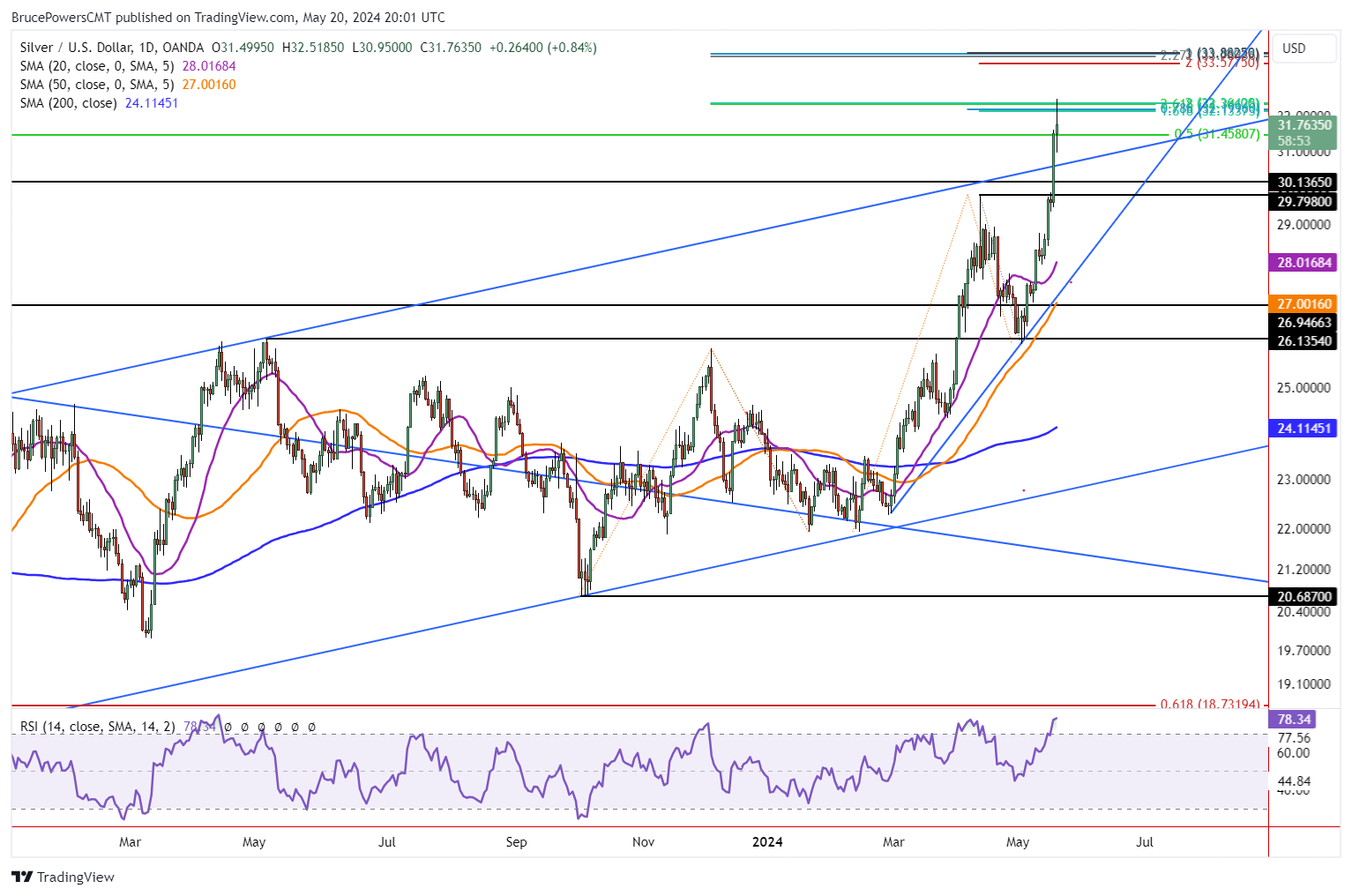 尽管如此,当前高点已将白银置于潜在阻力区,即使不是更大的回调,也可能导致回调。