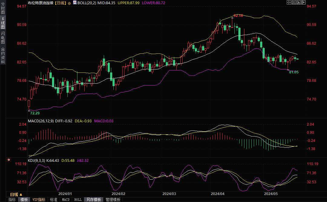 布伦特原油期货周一下跌0.27美元,或0.3%,报收于每桶83.71美元;美国原油6月期货周一下跌0.26美元,或0.3%,报收于79.80美元,该合约将于周二到期;7月合约周一下跌0.38%,收报79.22美元/桶。这使