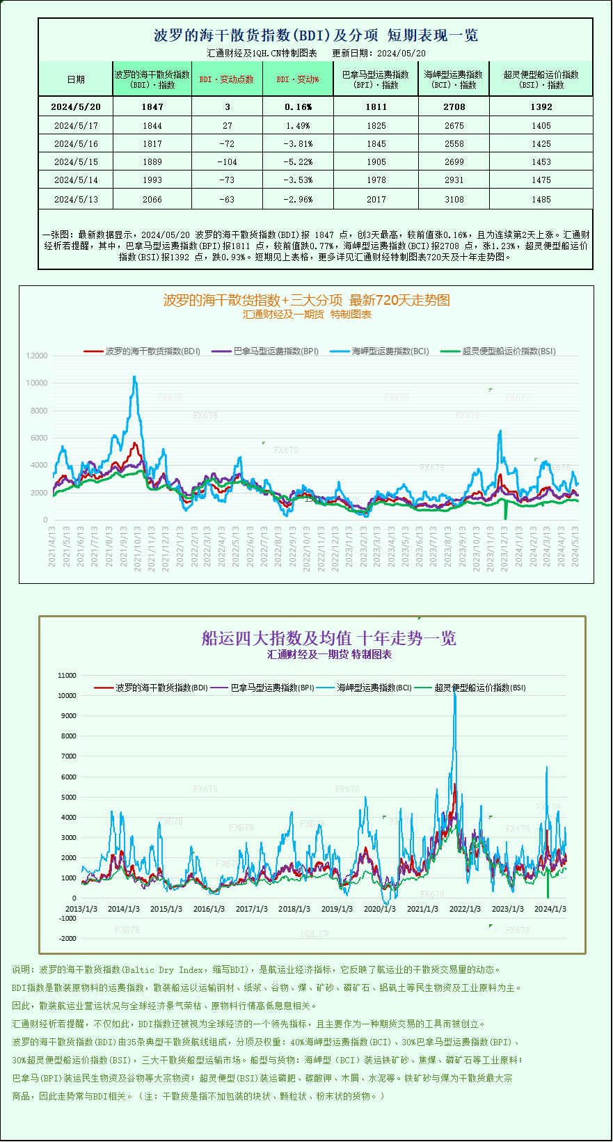 汇通财经APP讯——最新数据显示,2024/05/20 波罗的海干散货指数(BDI)报 1847 点,创3天最高,较前值涨0.16%,且为连续第2天上涨。其中,巴拿马型运费指数(BPI)报1811 点,较前值跌0.77%,海岬型运费指数(BCI)报2708 点,涨1.23%,超灵便型船运价指数(BSI)报1392 点,跌0.93%。波罗的海干散货指数+三大分项的最新720天走势图、十年走势图等详见汇通财经特制图表。