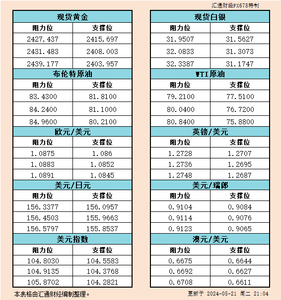 标题:5月21日美市支撑阻力:金银原油+美元指数等六大货币对
