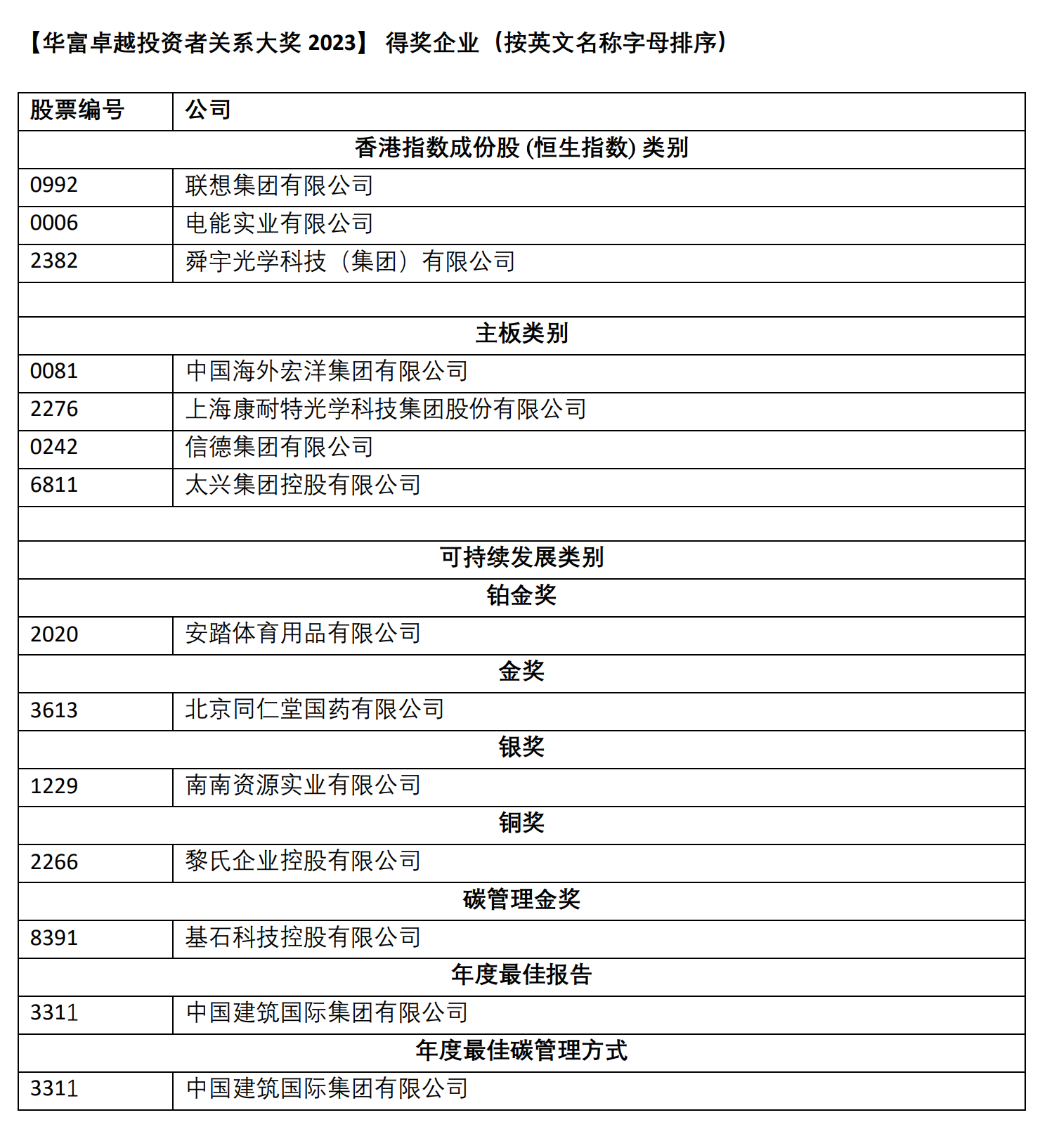 有出色表现的香港上市公司,得奖企业透过不同途径打开与投资者沟通之门,杰出的专业手腕为投资者关系工作树立了最佳典范,值得表扬。第九届「华富卓越投资者关系大奖」获上市公司热