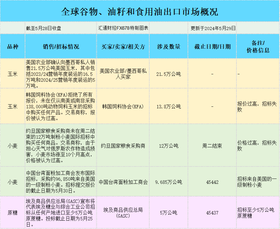 全球谷物、油籽和食用油出口市场招标、采购概况(24年5月29日):