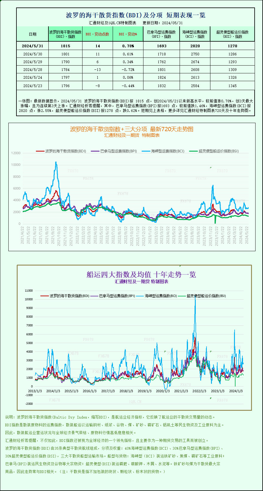 汇通财经APP讯——最新数据显示,2024/05/31 波罗的海干散货指数(BDI)报 1815 点,创2024/05/21以来新高水平,较前值涨0.78%,创3天最大涨幅,且为连续第3天上涨。其中,巴拿马型运费指数(BPI)报1693 点,较前值跌1.46%,海岬型运费指数(BCI)报2820 点,涨2.55%,超灵便型船运价指数(BSI)报1278 点,跌0.62%。波罗的海干散货指数+三大分项的最新720天走势图、十年走势图等详见汇通财经特制图表。