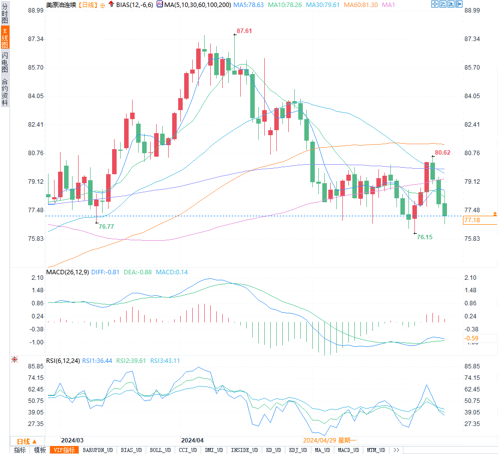 周五,WTI原油期货收跌0.92美元/桶,跌幅1.18%,报76.99美元/桶,而