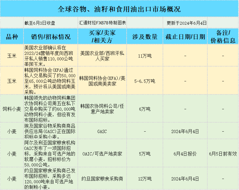 全球谷物、油籽和食用油出口市场招标、采购概况(24年6月4日):