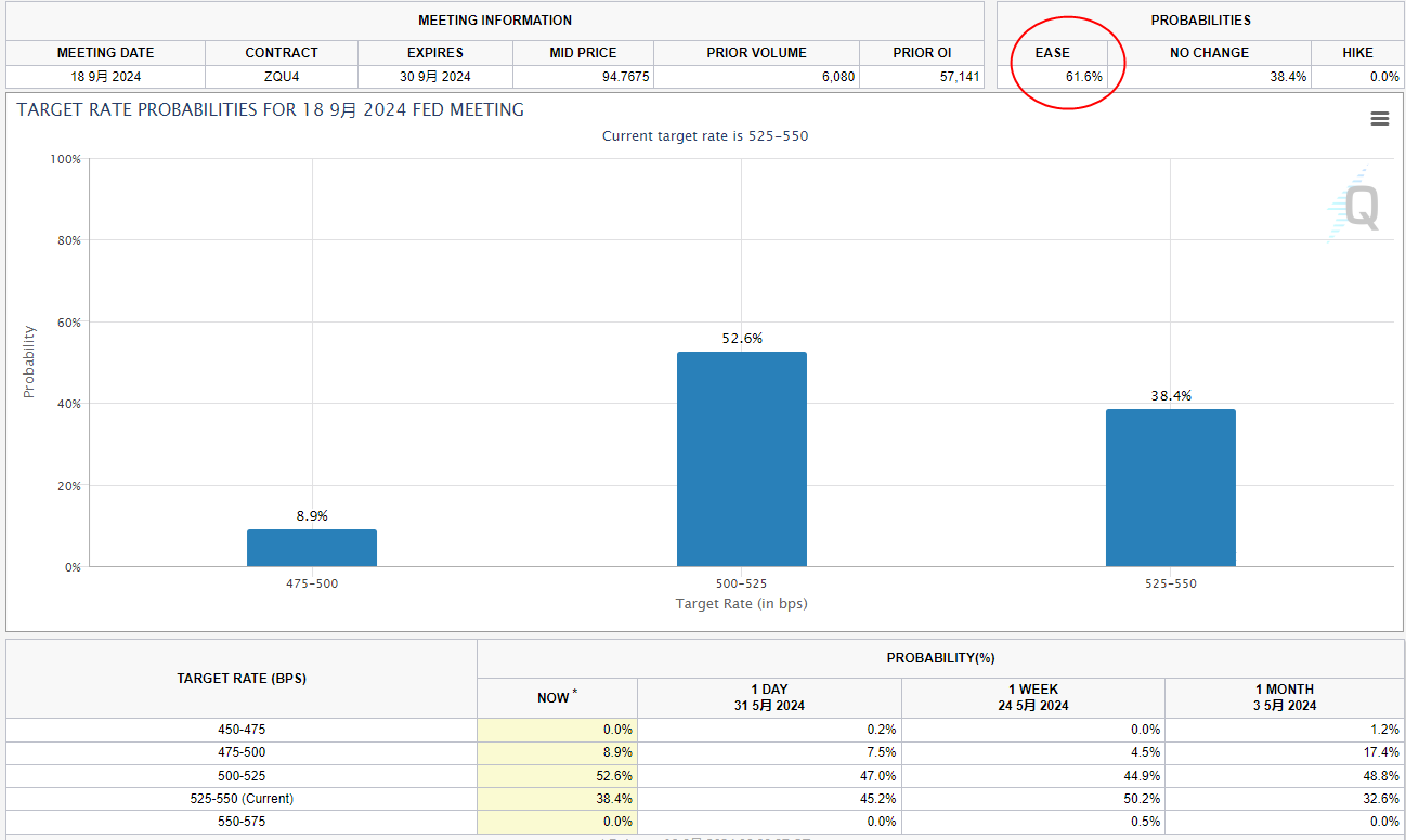 近期数据的疲软表现已经开始支持投资者心中美联储在大约三个月后开始降息的观点。ISM数据公布后,利率期货走势显示,美联储9月份将指标利率从去年7月以来一直保持的5.25%至5.50%区间下调的可能性约为60%。