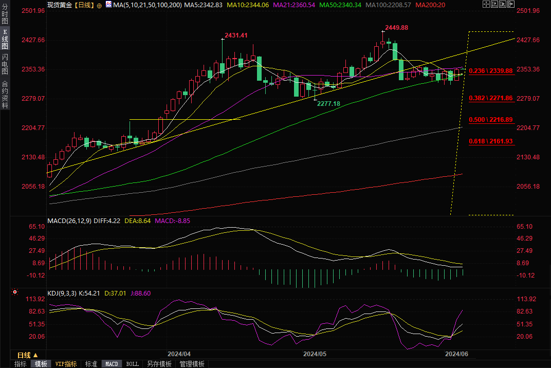 除了欧洲央行利率决议,本交易日投资者还需关注美国5月挑战者企业裁员人数和美国初请失业金人数变动,留意地缘局势的相关消息。技术面来看,金价目前仍处于2315-2364的震荡区间,不过KDJ重新结成金叉运行,