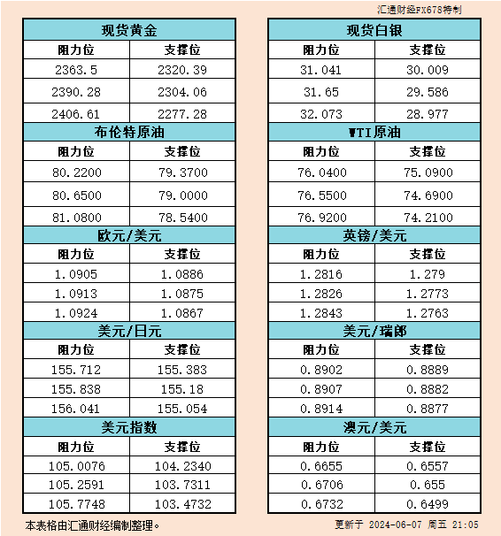 标题:6月7日美市支撑阻力:金银原油+美元指数等六大货币对