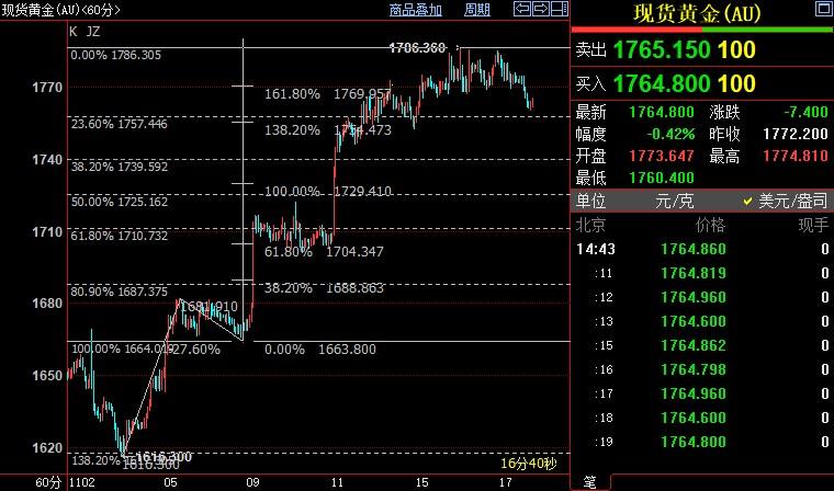 现货黄金下跌0.46%至1765.41美元/盎司;COMEX期金主力合约下跌0.42%至1768.3美元/盎司;