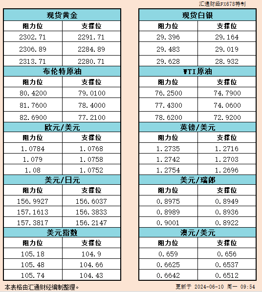 6月10日亚市支撑阻力:金银原油+美元指数等六大货币对