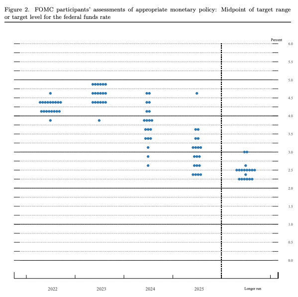美联储周三将联邦基金利率目标区间提高75个基点,至3.00%-3.25%,并在最新预测中暗示会继续大幅度加息。预测显示,美联储政策利率今年底将升至4.40%,在2023年达到4.60%的峰值,以对抗持续强劲的通胀。